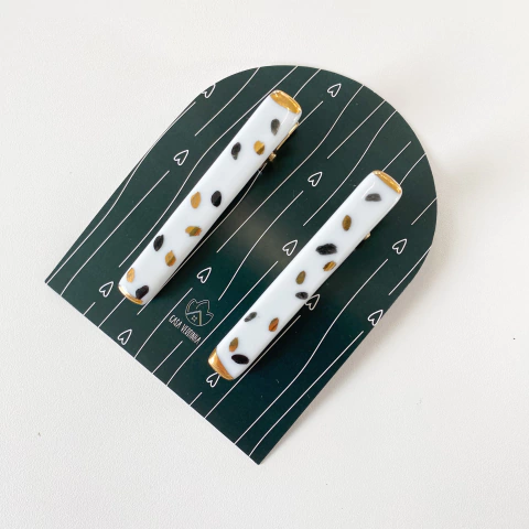 Preparamos essa jóia linda especialmente para você celebrar sua beleza e brilhar muito. Presilhas lindas com plaquinha exclusiva Casa verdinha pintada com pontinhos em preto e com lindos detalhes em ouro 12k. Pode confiar, ela prende super bem o cabelo <3